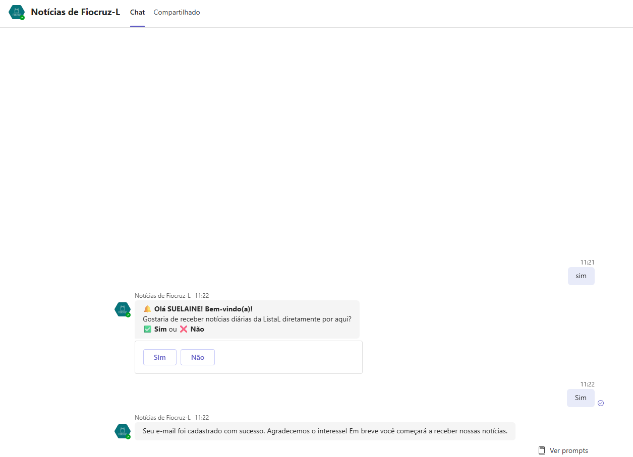Após o cadastro, basta enviar uma mensagem para o bot diretamente no Microsoft Teams para começar a receber as atualizações de notícias resumidas da FiocruzL!